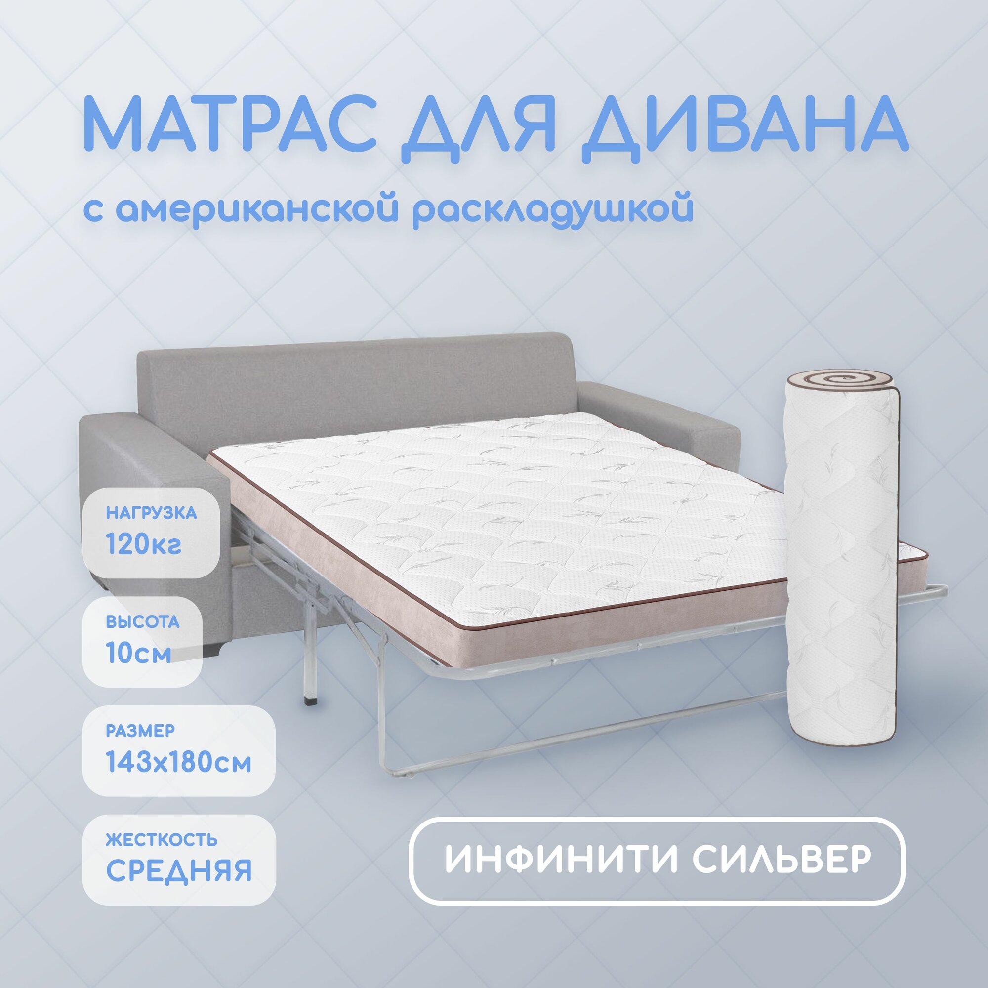 Купить Матрас для дивана с американской раскладушкой 143х180х10, анатомический Инфинити Сильвер, беспружинный