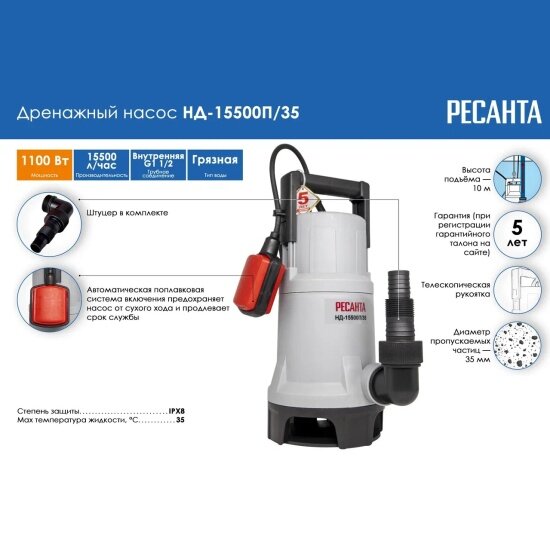 Купить Насос / Дренажный насос НД-15500П/35 Ресанта (1100 Вт, макс. напор – 10 м, 15500 л/час, для грязной воды, диаметр пропускаемых частиц – 35 мм, 1.5“)