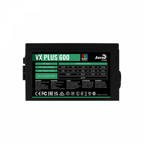 Блок питания Aerocool VX Plus 600 RGB 600W, ATX v2.3, RGB Fan 12cm, 500mm cable, Retail (VX PLUS 600 RGB)