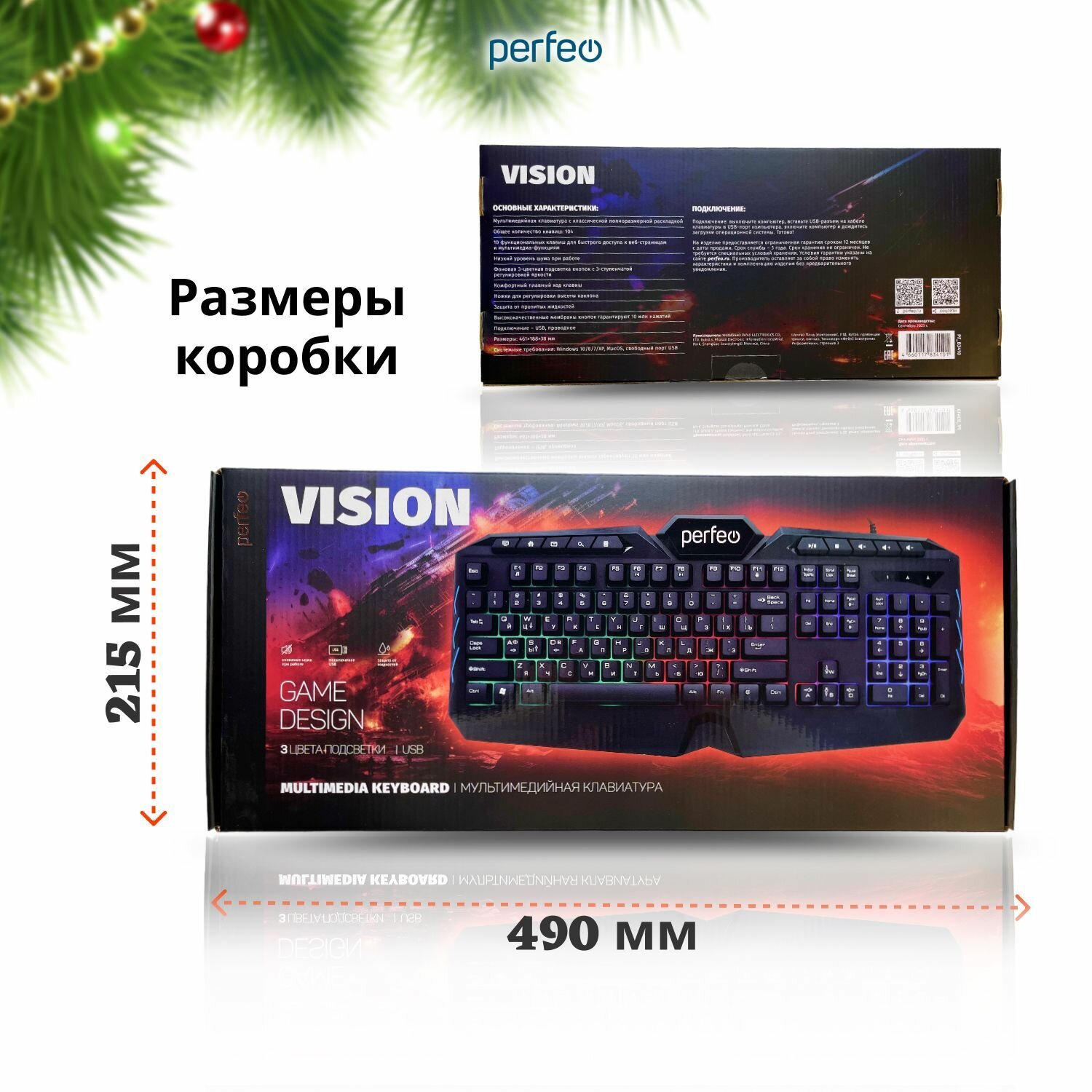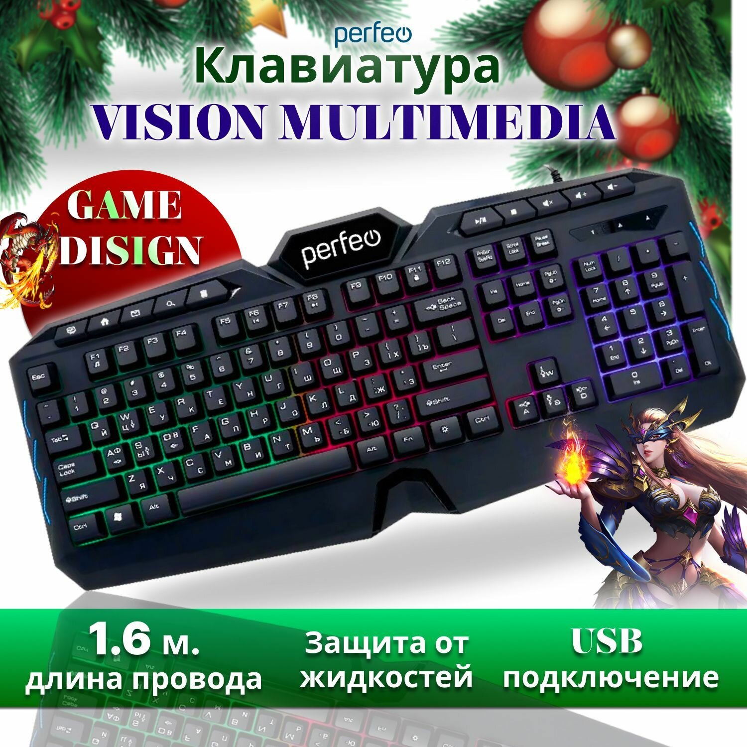 Купить Игровая клавиатура для компьютера с подсветкой VISION Multimedia, мембранная проводная USB подключение, черная, Perfeo