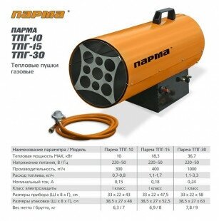 Ниже Вы можете прочитать отзывы на Парма ТПГ-15 Тепловая пушка газовая, ознакомится с подробными характеристиками, посмотреть интересные обзоры и фотографии на Парма ТПГ-15 Тепловая пушка газовая.