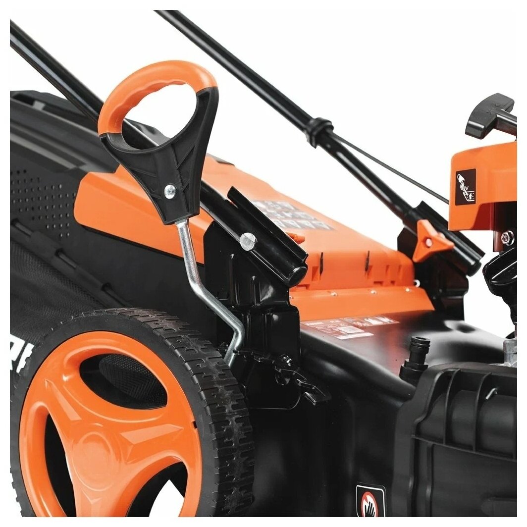 | Плюсы: | Ширина покоса, боковой выброс, большой травосборник с ручкой сверху, легкое перемещение, удобная регулировка высоты покоса. |