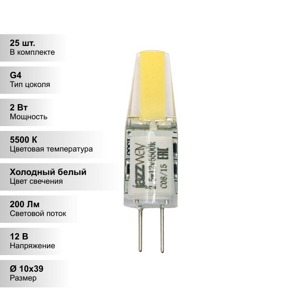 (15 шт.) Светодиодная лампочка Jazzway G4 12V 2.5W(200lm) 5500K 4K LED-драйвер PLED-G4 COB .2855770 . Цоколь G4