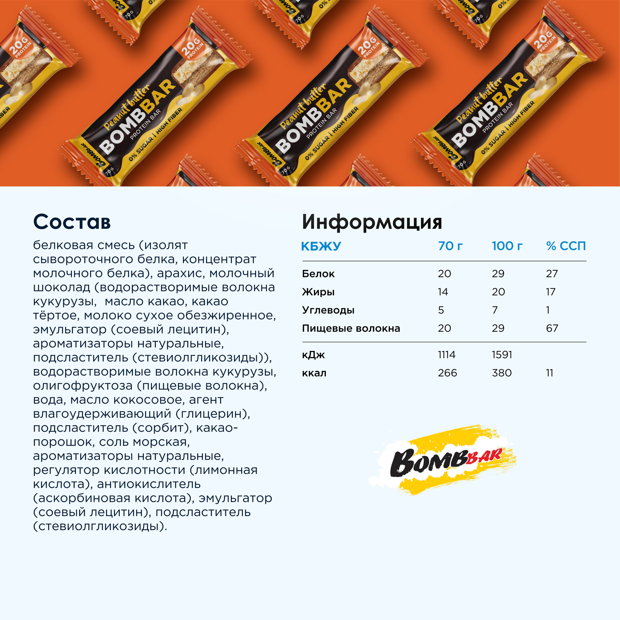 Протеиновый батончик BOMBBAR, Арахисовая паста (20шт по 70г)