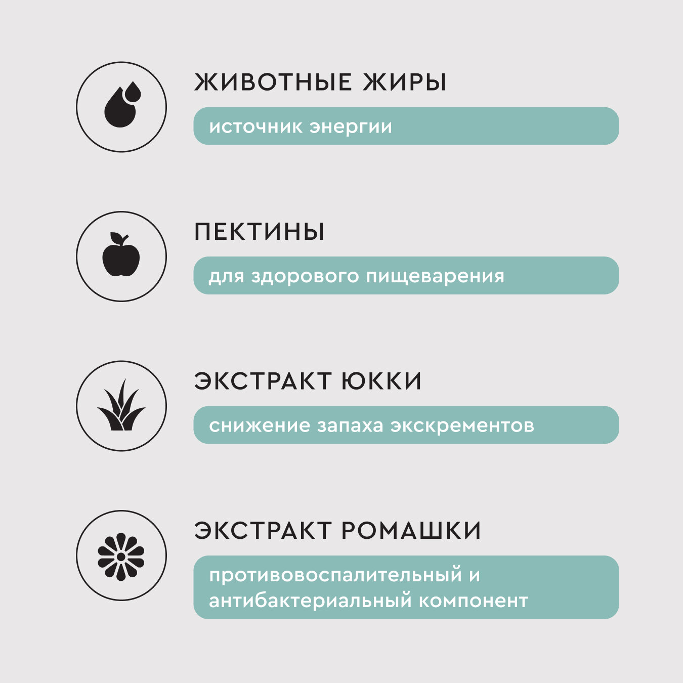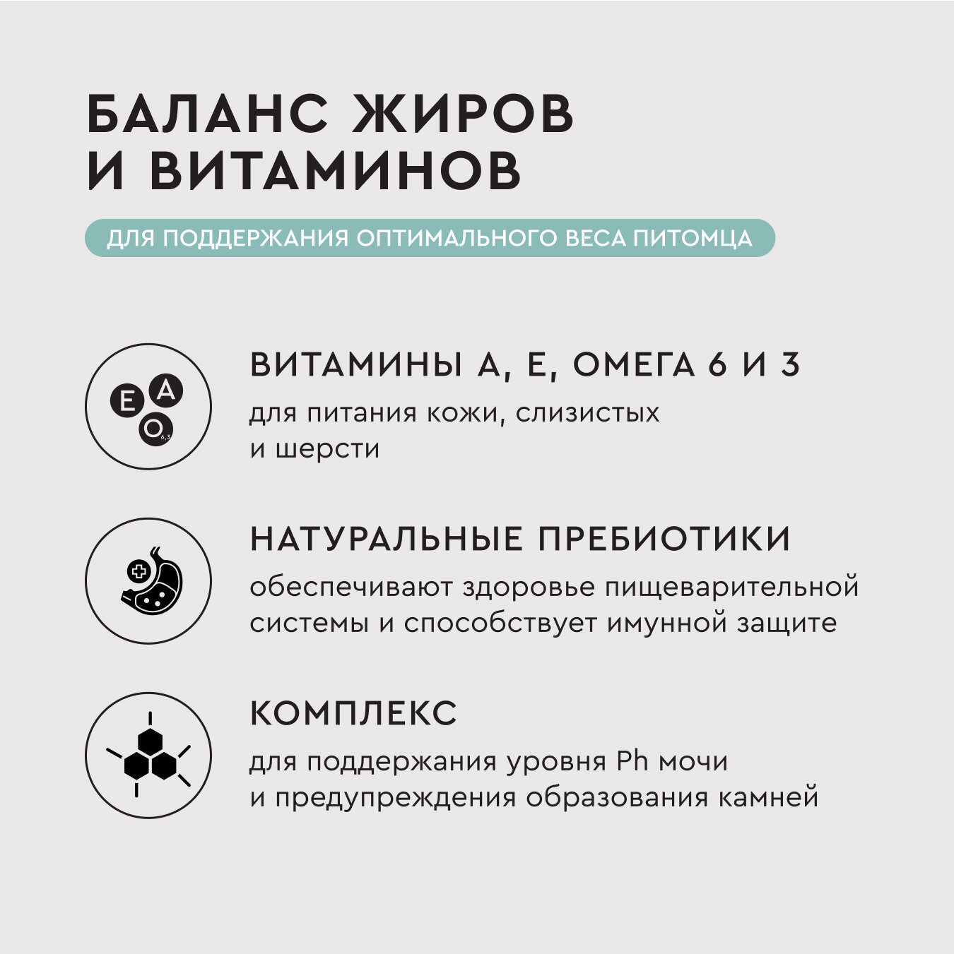 | Особые потребности | гипоаллергенный / для здоровья кожи и блеска шерсти / для здоровья костей и суставов |