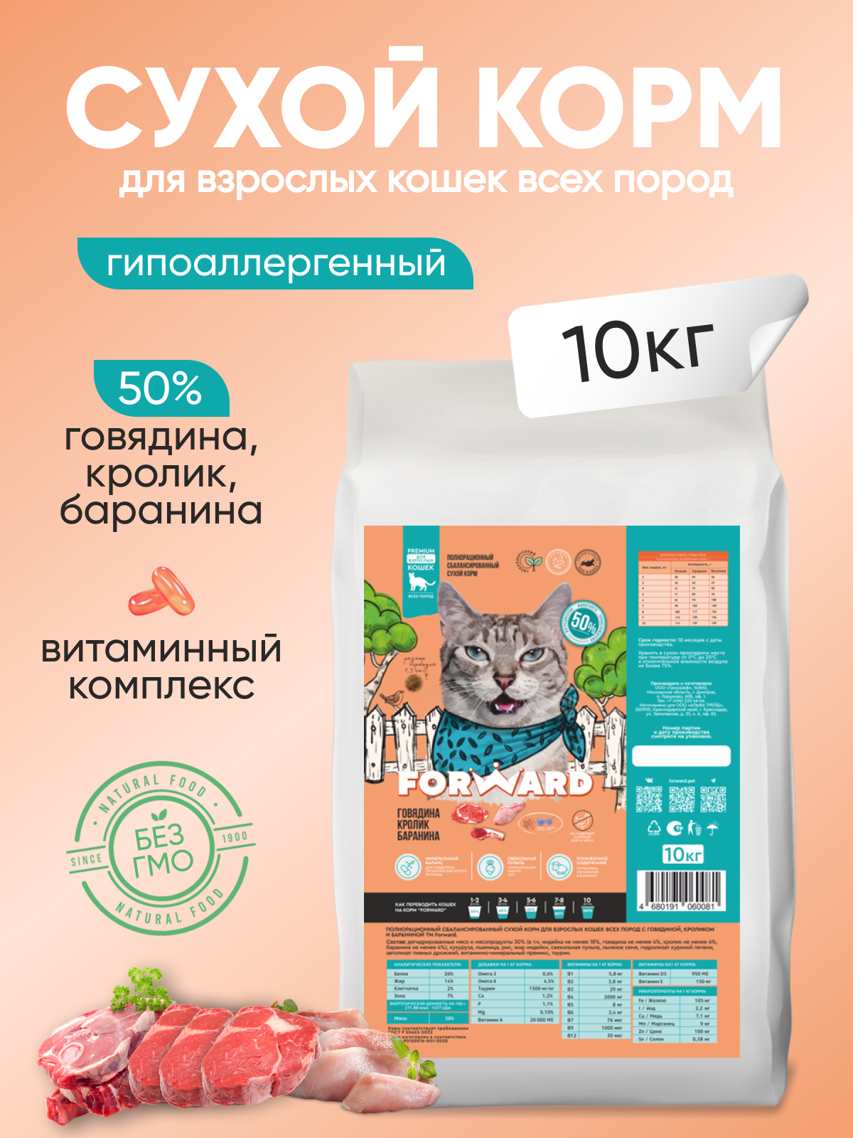Сухой корм премиум класса "FORWARD" для кошек с говядиной, кроликом и бараниной, 10кг