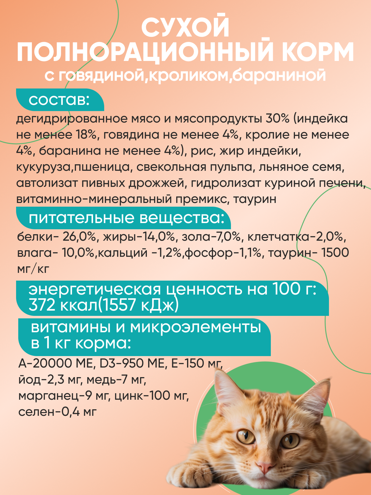 | Состав | Дегидрированные мясо и мясопродукты 30% (в т.ч. говядина —не менее 4%, кролик — не менее 4%, баранина — не менее 4%), куруруза, пшеница, рис, жир индейки, свекольная пульпа, льняное семя, гидролизат куриной печени, автолизат пивных дрожжей, витаминно-минеральный премикс, таурин. |