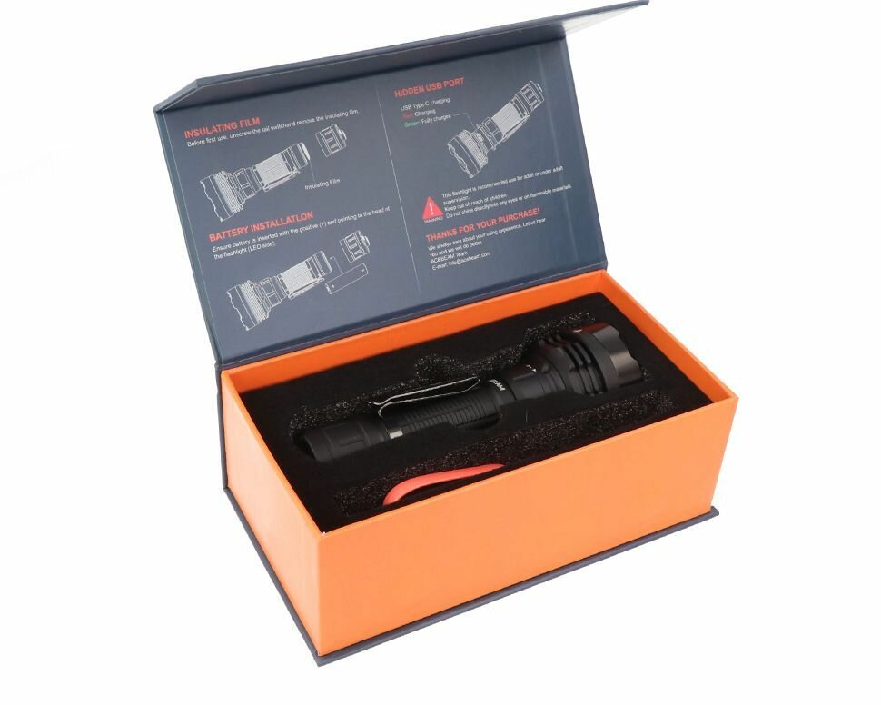 | Подробная комплектация | Фонарь Acebeam P18 Defender Кабель USB зарядки Аккумулятор Li-ion Acebeam IMR21700NP-510A Запасные уплотнительные кольца 2 шт. Ключ шестигранник Темляк Упаковка Гарантийный талон Инструкция |