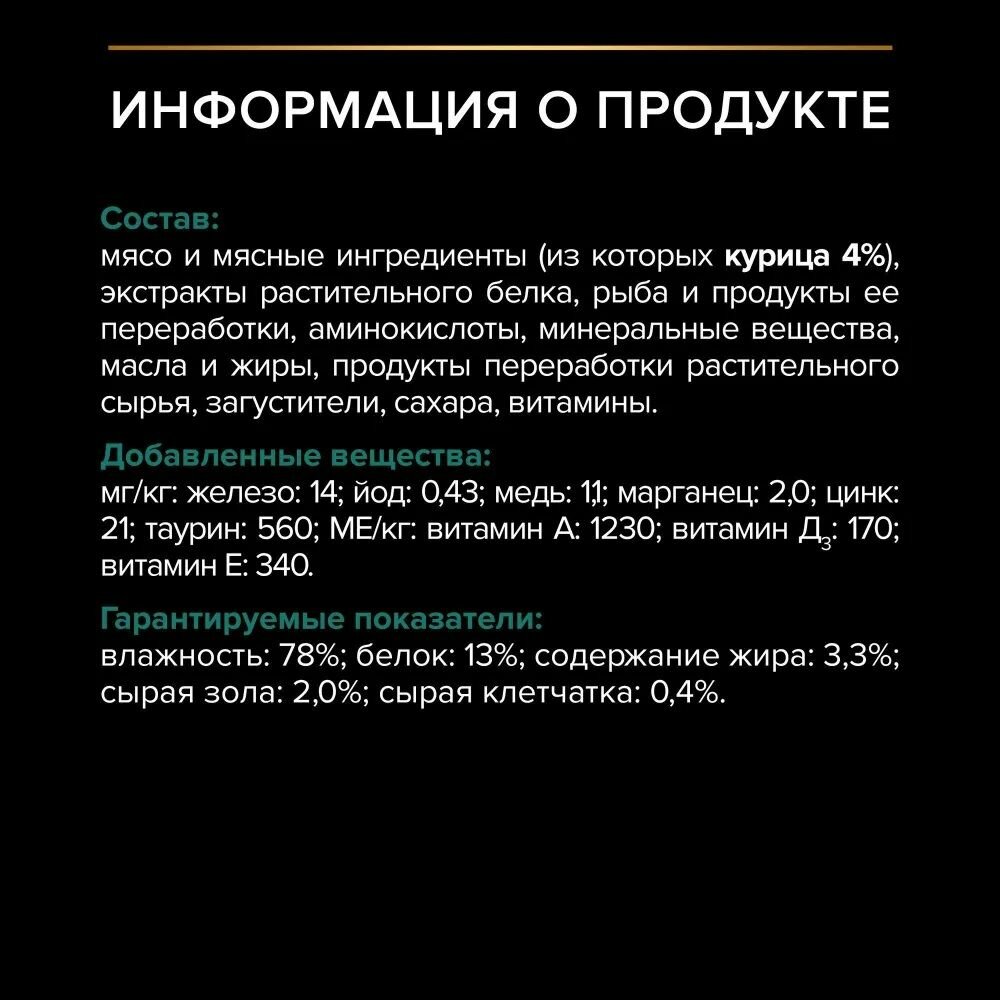 | Дополнительная информация | Давайте корм комнатной температуры. Не замораживать. Давайте воду без ограничений. Корм для домашних животных не предназначен для употребления в пищу человеку. Для здоровья Вашей кошки регулярно консультируйтесь с ветеринарным врачом. |