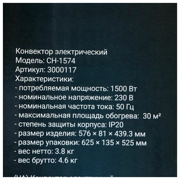 | Подробная комплектация | Электрический конвектор - 1 шт., Комплект для напольного и настенного размещения |