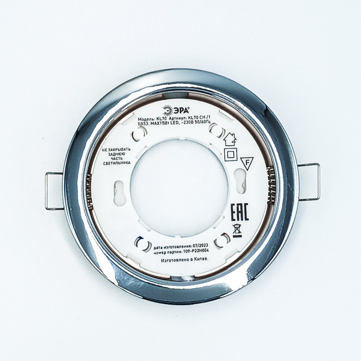 Сохранить(3 шт.) Ультратонкий встраиваемый светильник ЭРА KL70 CH/1 для ламп с цоколем GX53 макс. 15 Вт, напряжение питания 220 В, размер 100x18 мм, врезное отверстие 90 мм, цвет хром, штампованная сталь интересное: