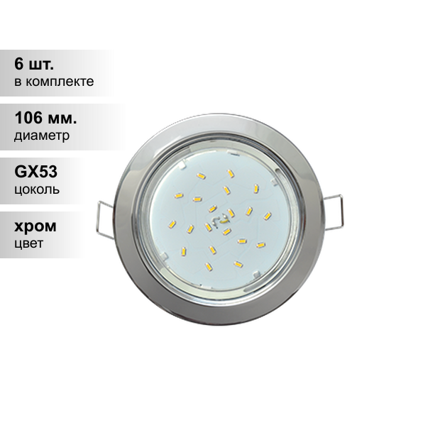 Сохранить(6 шт.) Светильник встраиваемый Ecola GX53 для ламп с цоколем GX53 макс. 20 Вт, цвет хрои, размер 106x38, врезное отверстие 90 мм, термокольцо в комплекте, FC53H4ECB интересное: