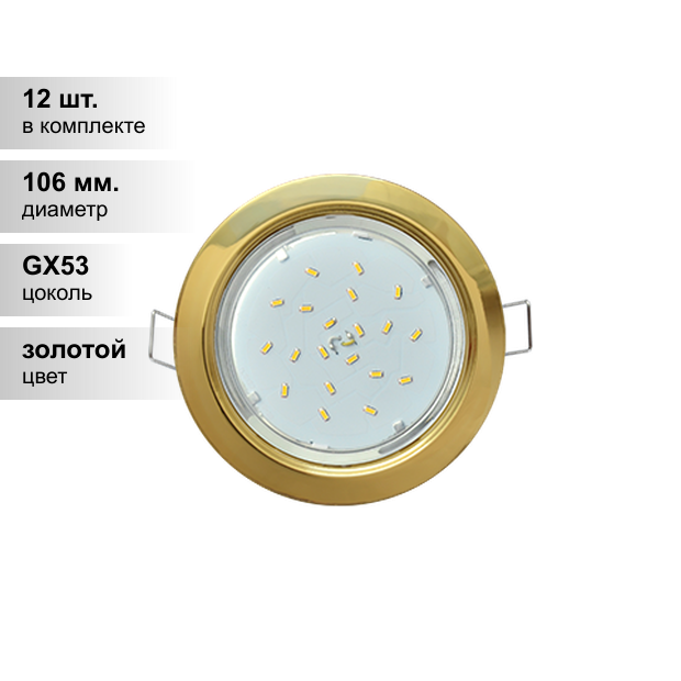 Купить (12 шт.) Светильник встраиваемый Ecola GX53 для ламп с цоколем GX53 макс. 20 Вт, цвет золото, размер 106x38, врезное отверстие 90 мм, термокольцо в комплекте, FG53H4ECB