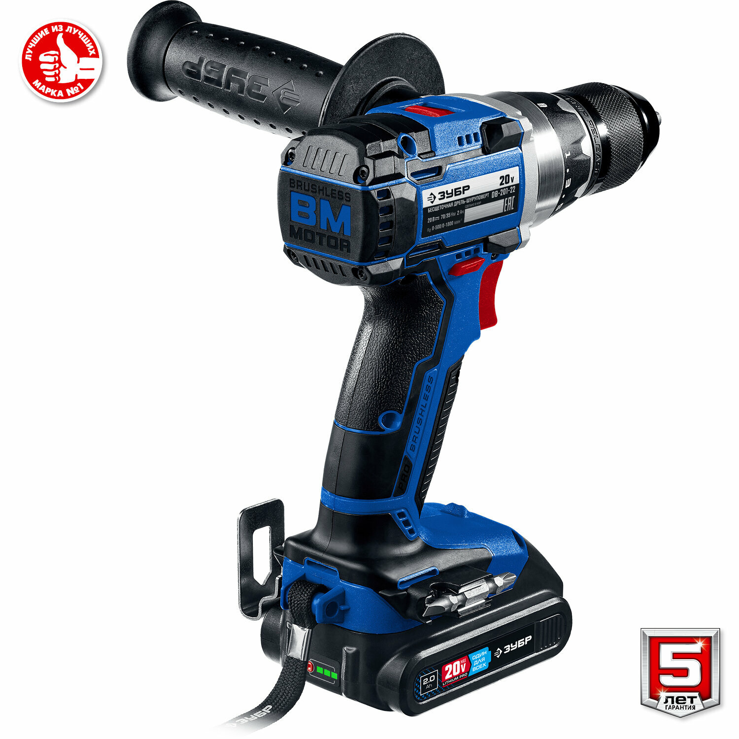 ЗУБР 20 В, бесщеточная, 2 АКБ (2Ач), в кейсе, ударная дрель-шуруповерт DBS-201-22 Профессионал