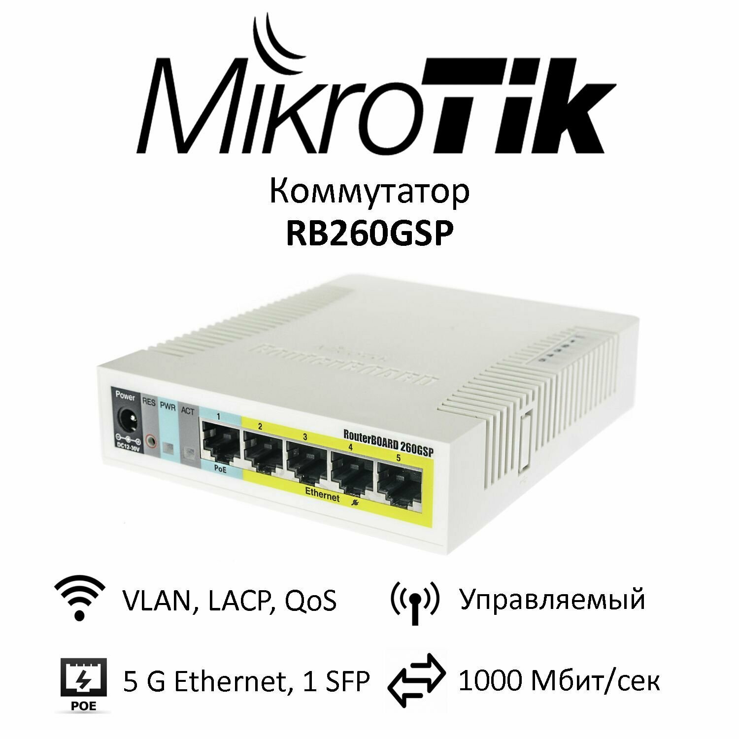 Коммутатор MikroTik RB260GSP with 5 Gigabit ports and SFP cage, SwOS, plastic case, PSU, POE-OUT