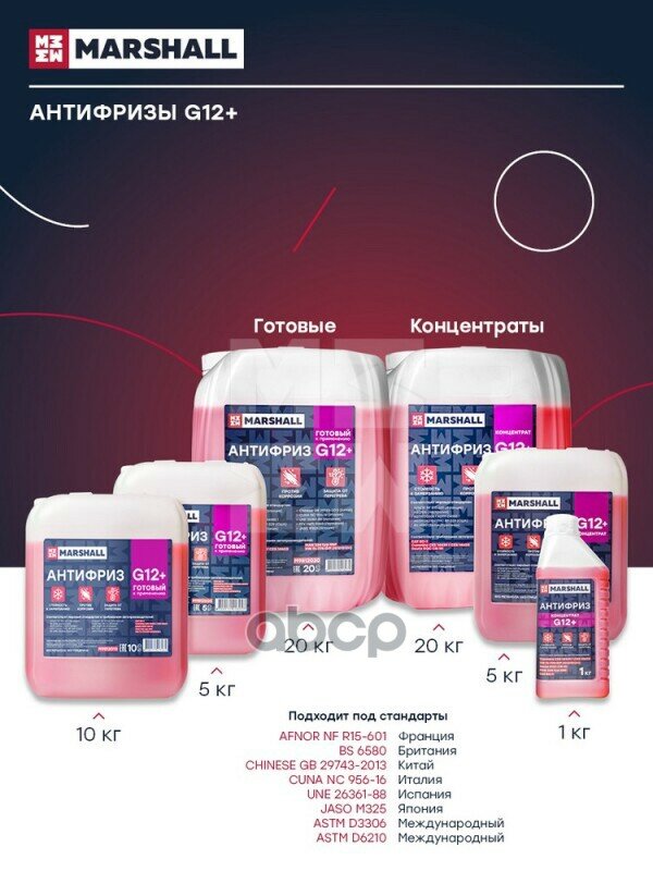 Антифриз Marshall G12+, Концентрат 1:1, Красный, Канистра 1 Кг. (M9822001) MARSHALL арт. M9822001