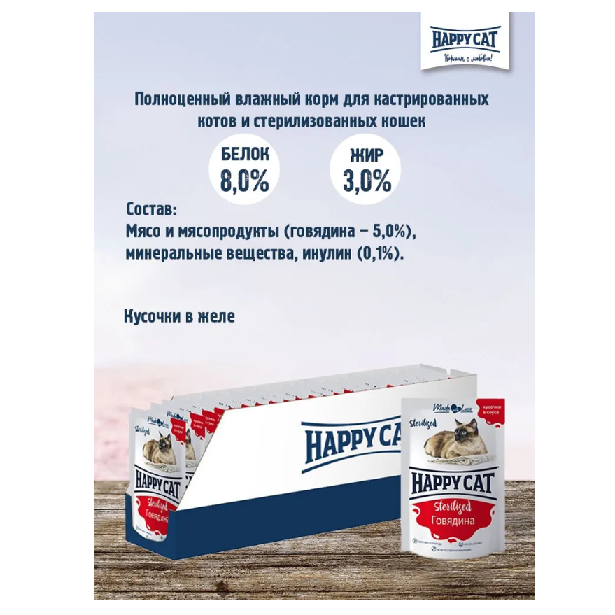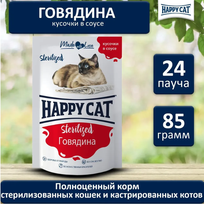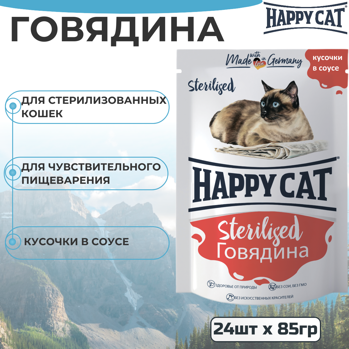 Happy Cat паучи для взрослых стерилизованных кошек и кастрированных котов, с говядиной, кусочки в соусе - 85 г х 24 шт