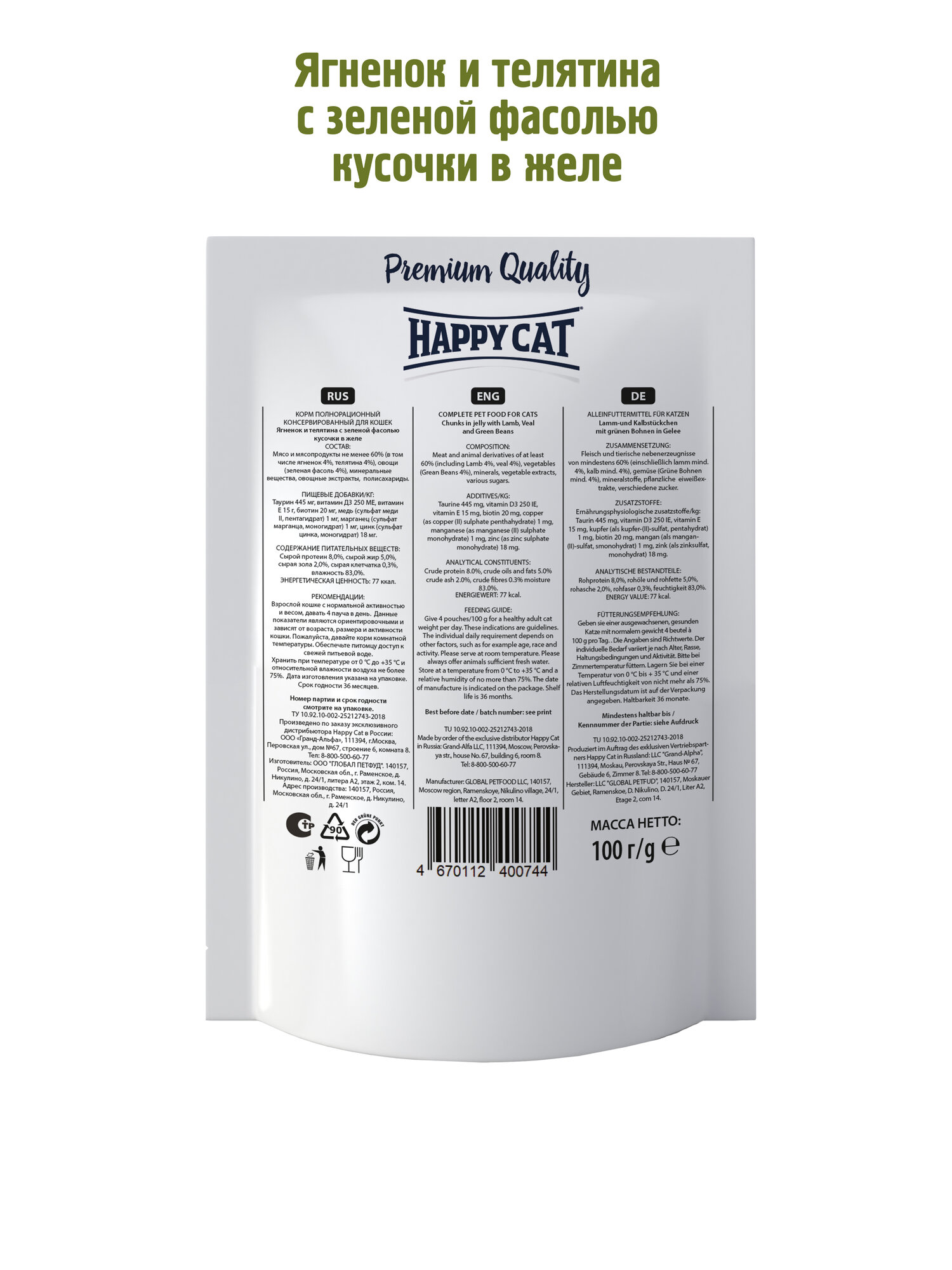 HAPPY CAT для взрослых кошек с ягненком, телятиной и зеленой фасолью в желе пауч 100 гр 7502307 100 гр х 12 шт