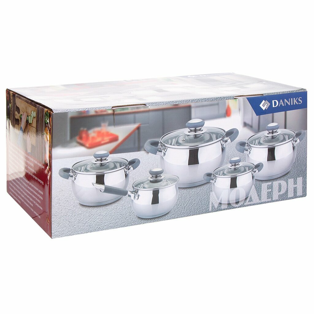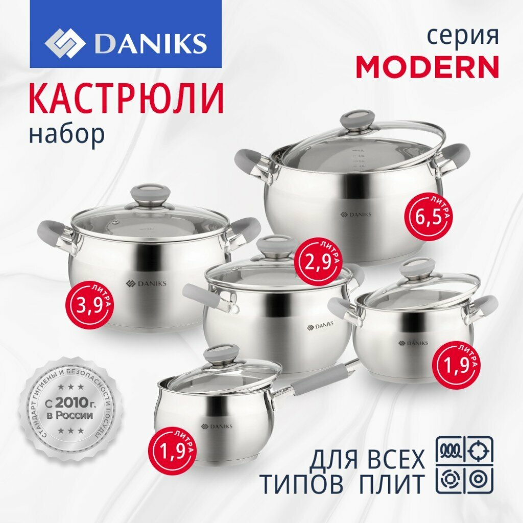 Купить Набор посуды нержавеющая сталь, 10 предметов, кастрюли 1.9,2.9,3.9,6.5 л, ковш 1.9 л, индукция, Daniks, Модерн,