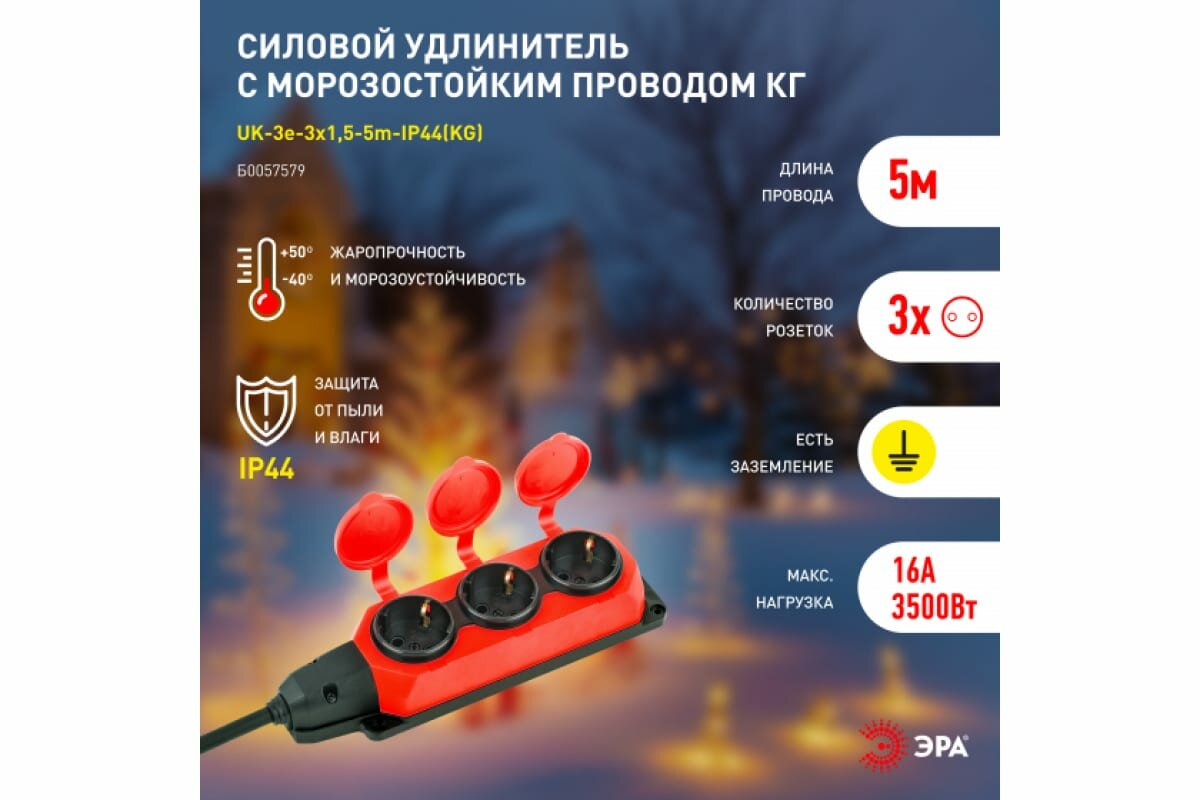 Купить ЭРА Удлинитель силовой UK3e3x1,55mIP44(KG) с заземлением 3 розетки каучук 5м КГ 3x1,5мм2 IP44 Б00575 .