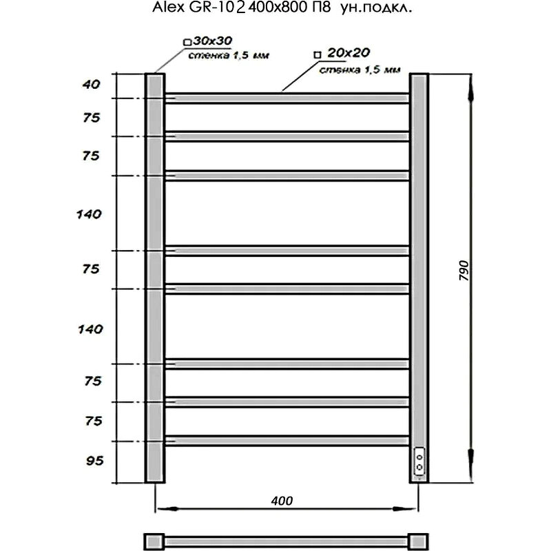 Полотенцесушитель электрический Alex GR-102 400х800 П8 white U универсальное подключение (левый/правый)