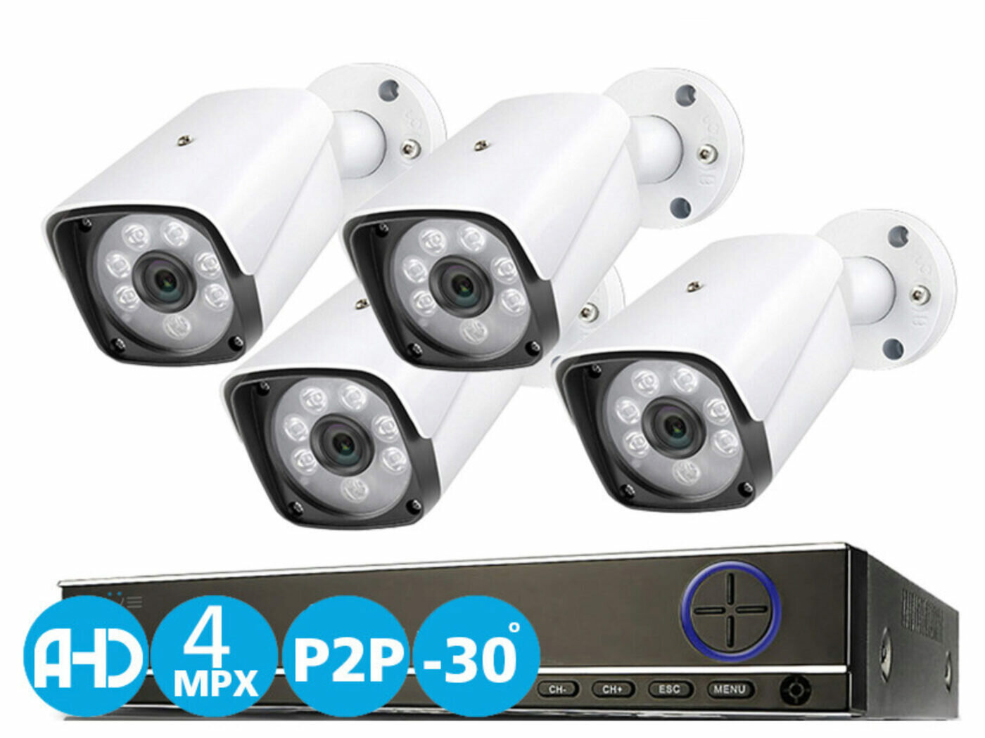 | Дополнительная информация | формат сжатия изображения H264, облачное подключение мобильных устройств - через QR код, разрешение при записи 4K (2688х1520), подключение по локальной сети Интернет, 3G, 4G, поддержка мобильных устройств Apple, Android, 4 всепогодные видеокамеры HD CMOS 4MPX камеры, матрица 1/4'' HD CMOS, объектив 2,8 мм, ИК подсветка ночью до 20 метров, рабочая температура камер: -30℃ ~ +50℃ |