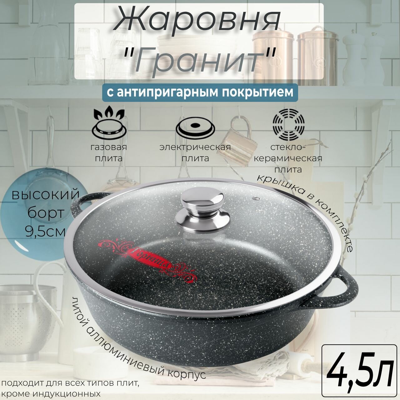 Жаровня алюминий, 4.5 л, антиприг, Горница, Гранит, ж7130аг, с крыш