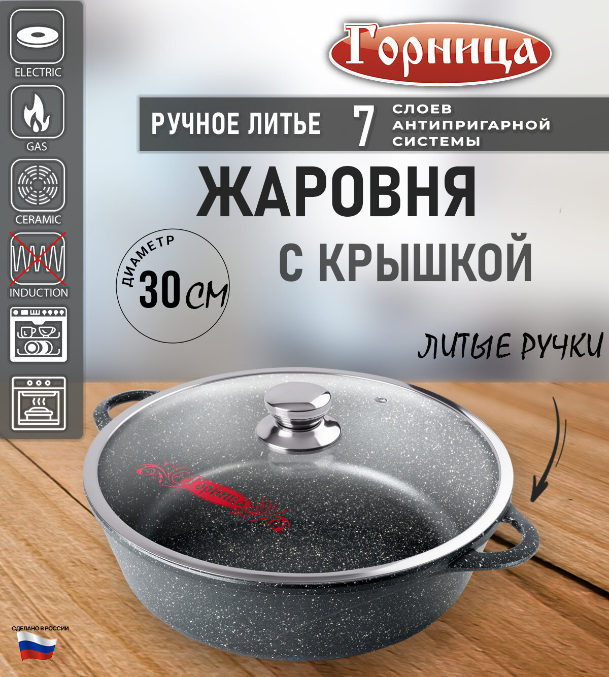 Жаровня 32 см, 5,5л., литые ручки, с крышкой, подарочная упаковка, серия Классик Горница