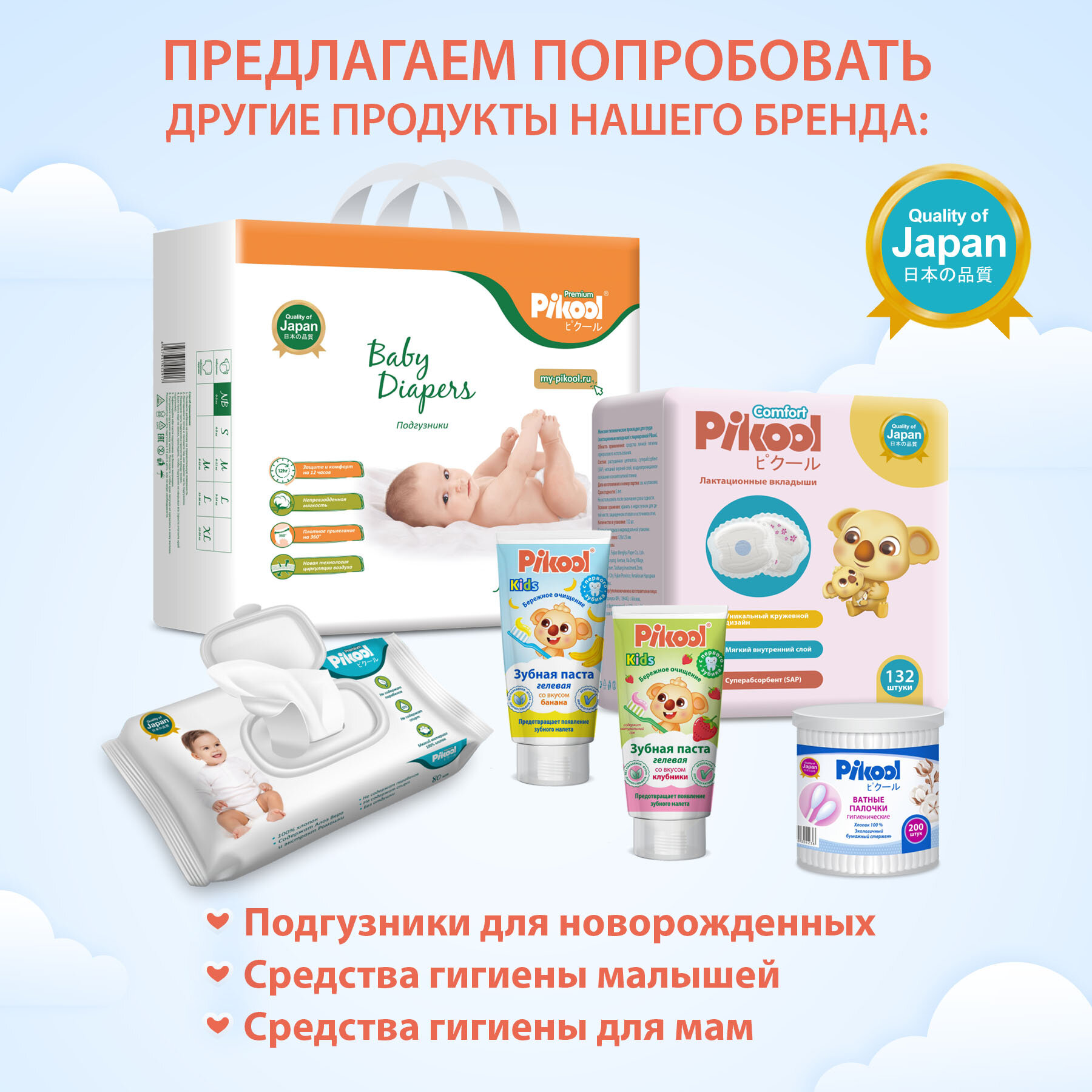 Подгузники детские Pikool Premium, размер L, 9-14 кг, 64 шт