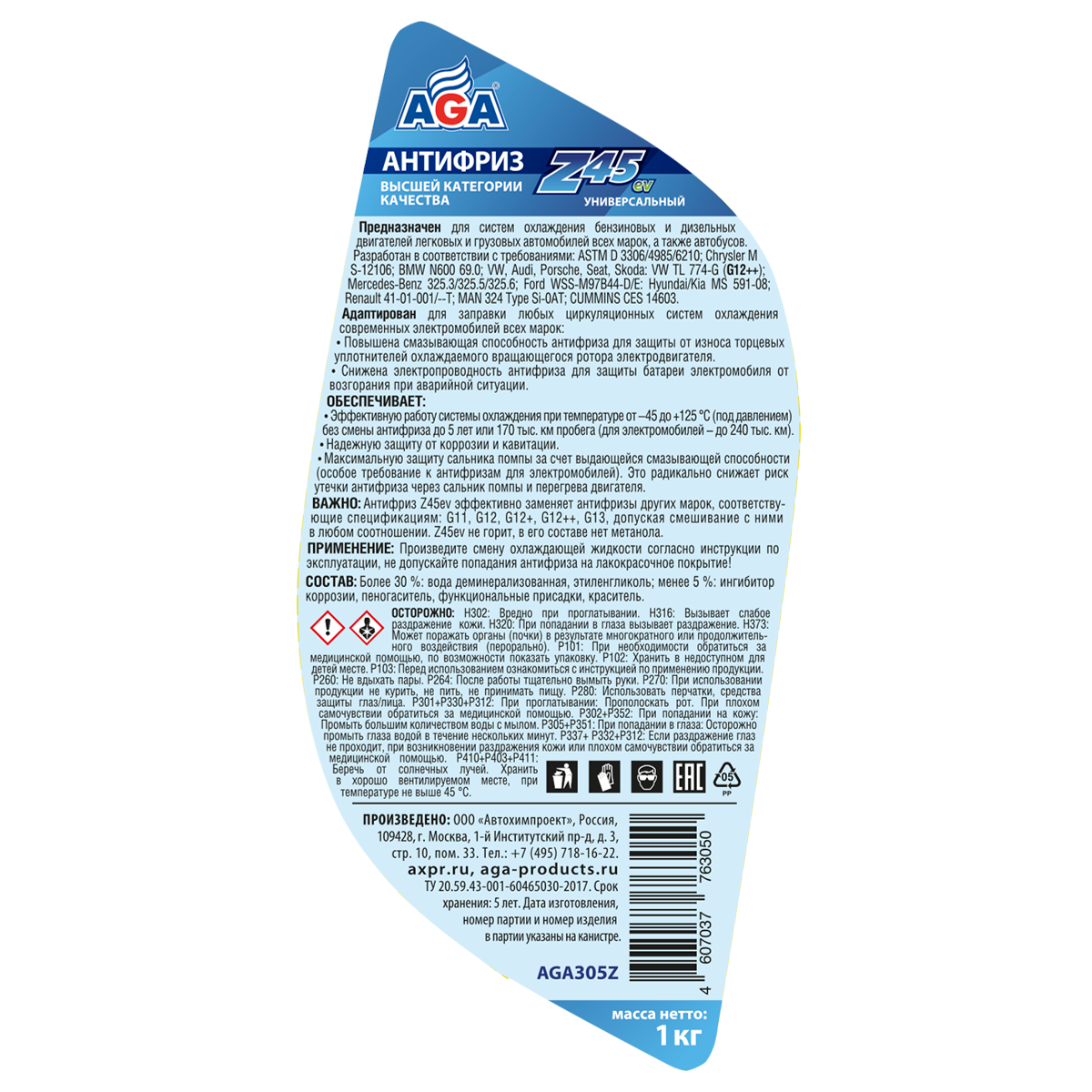 Антифриз Aga Z45 G12++ Готовый -45C Синий 1 Кг Aga305z (Допуск Для Электромобилей) Aga Арт. Aga305z AGA арт. AGA305Z