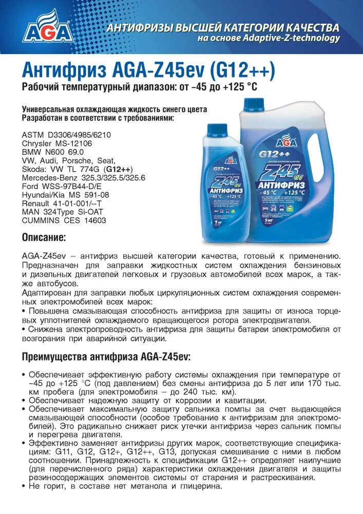 Антифриз Aga Z45 G12++ Готовый -45C Синий 1 Кг Aga305z (Допуск Для Электромобилей) Aga Арт. Aga305z AGA арт. AGA305Z