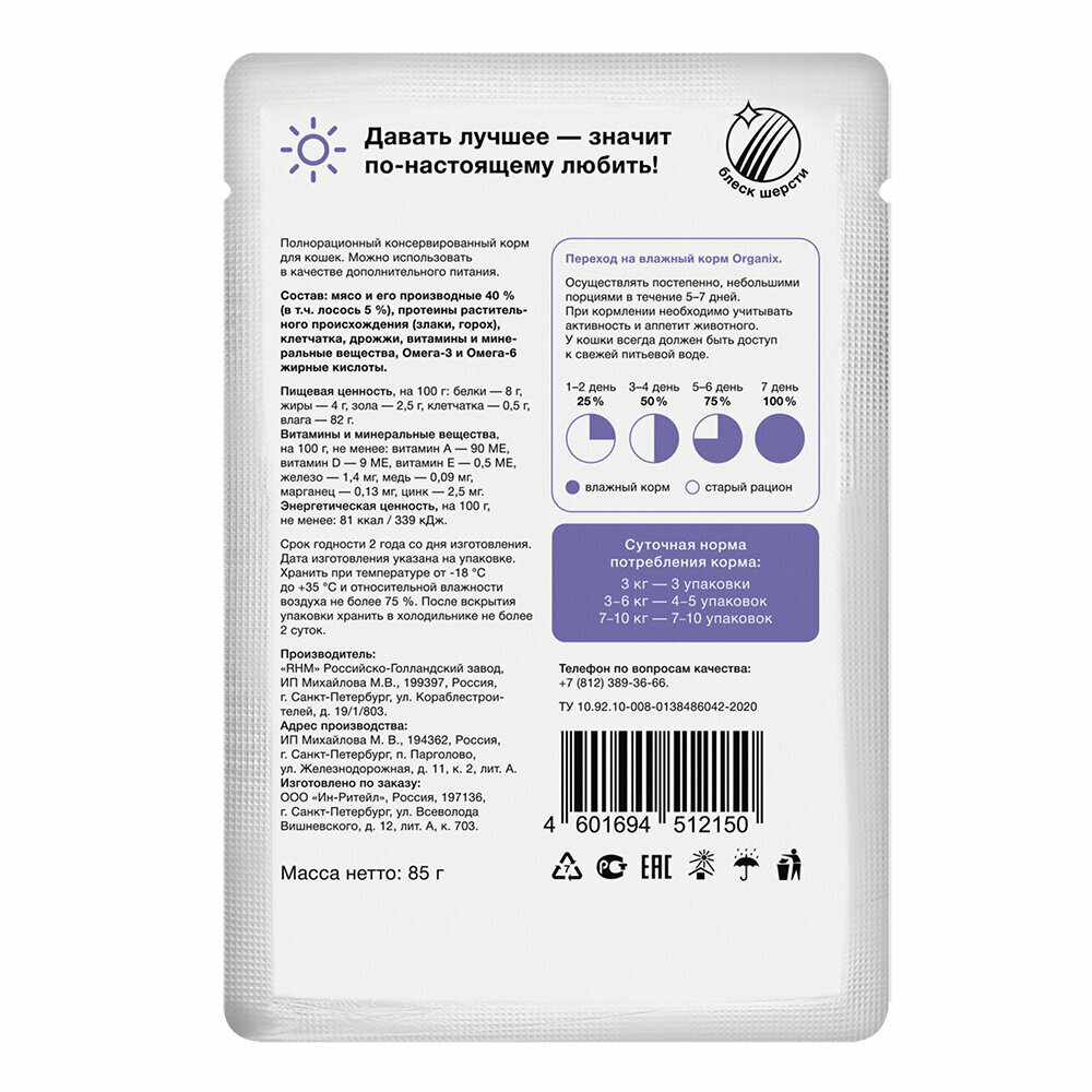 Купить ORGANIX идеальная кожа И шерсть для взрослых кастрированных котов и стерилизованных кошек с лососем в соусе (85 гр х 25 шт)