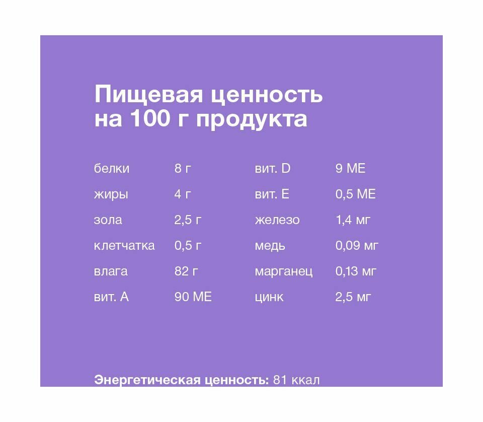 | Пищевая ценность | белки – 9 %, жиры – 3 %, зола – 2,5 %, клетчатка – 0,5 %, влажность – 82 % |