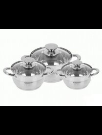 | Дополнительная информация | литые ручки из нержавеющей стали; крышка из термостойкого стекла с отверстием для выпуска пара; трехслойное капсульное дно; капсульное дно; диаметры кастрюль: 16, 18, 20 см |