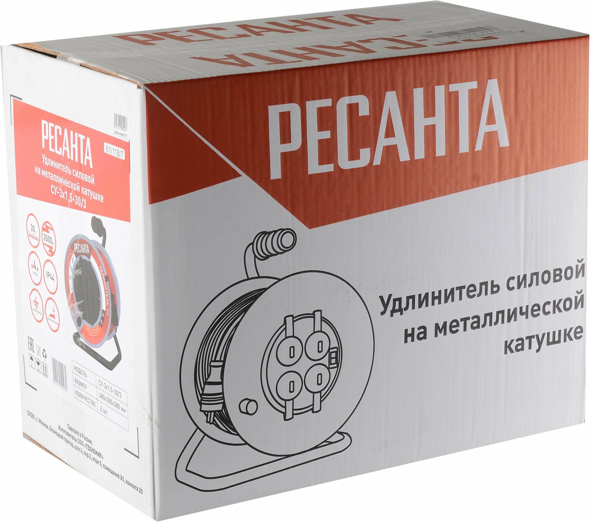 Удлинитель силовой на металлической катушке Ресанта СУ-3х1,5-30/3 (с выкл., 4 розетки, IP44)