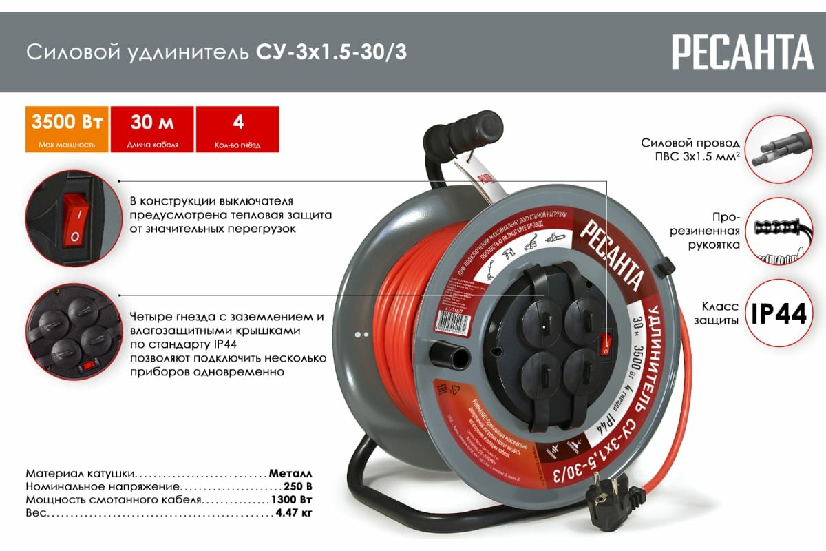 Ниже Вы можете прочитать отзывы на Удлинитель РЕСАНТА СУ-3х1,5-30/3 // 30м, 4 розетки, катушка -металл, ознакомится с подробными характеристиками, посмотреть интересные обзоры и фотографии на Удлинитель РЕСАНТА СУ-3х1,5-30/3 // 30м, 4 розетки, катушка -металл.