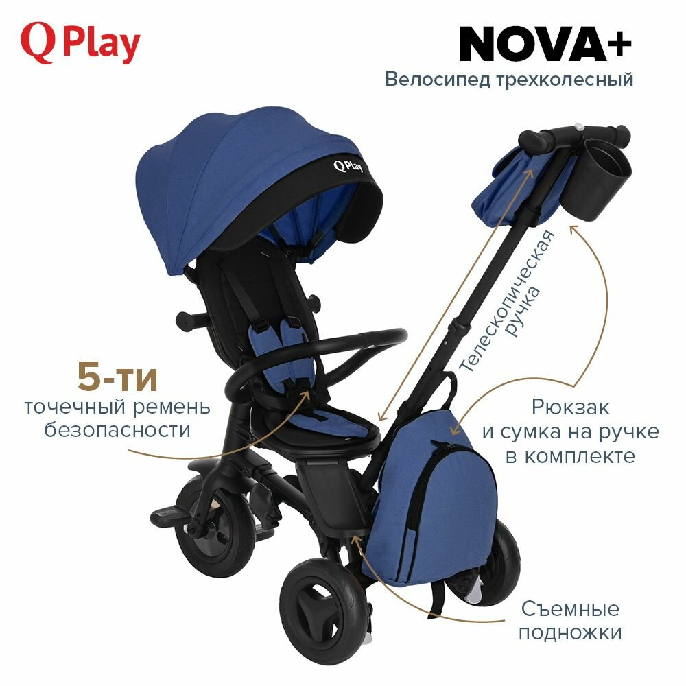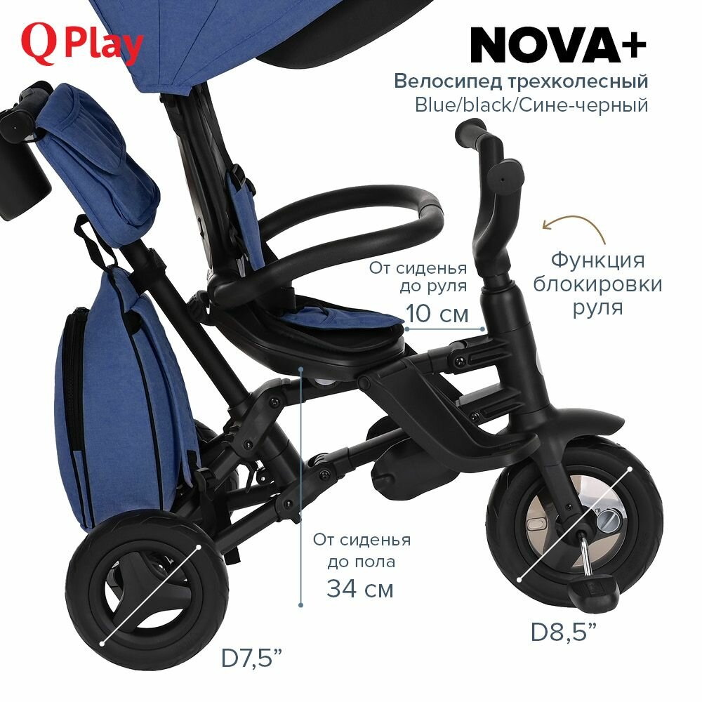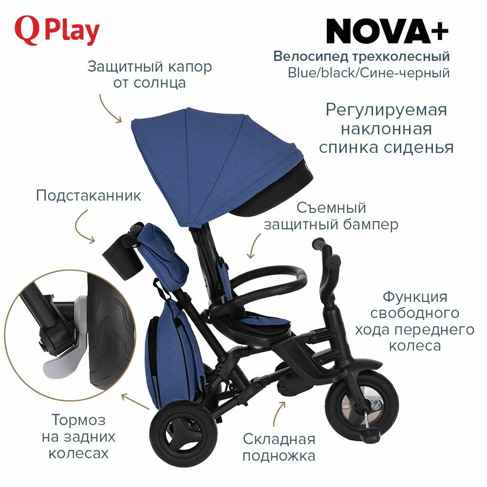 Трехколесный складной велосипед-коляска с поворотной сидушкой Qplay Nova+ 2023 Blue/black/Сине-черный