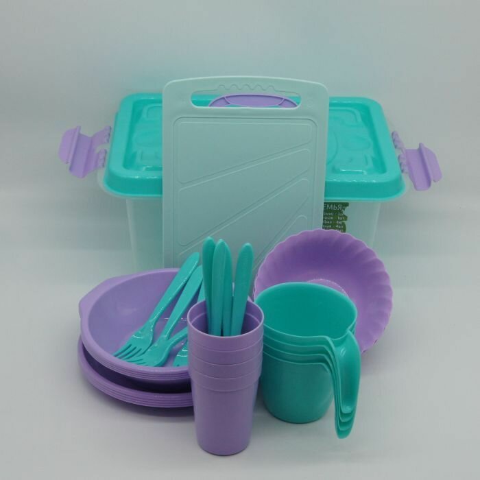 Набор походной пластиковой посуды в контейнере с ручкой для пикника, на шашлыки, для туризма, барбекю для 4 человек 17 предметов №24 АП 783 Пятница