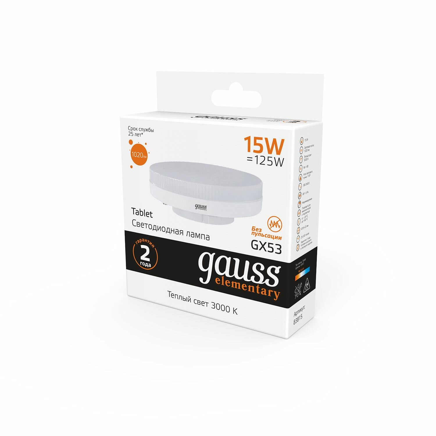 Лампа светодиодная Gauss Elementary GX53 15Вт цок.:GX53 таблетка 220B 3000K св.свеч.бел.теп. (упак.:1шт) (83815)