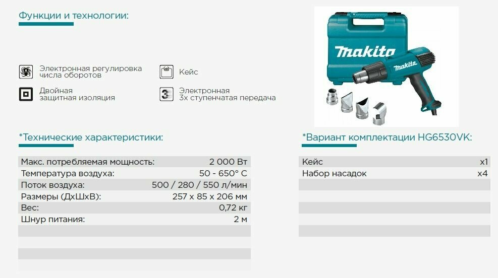 Технический фен Makita HG6530VK 2000Вт температура50-650С интересное: