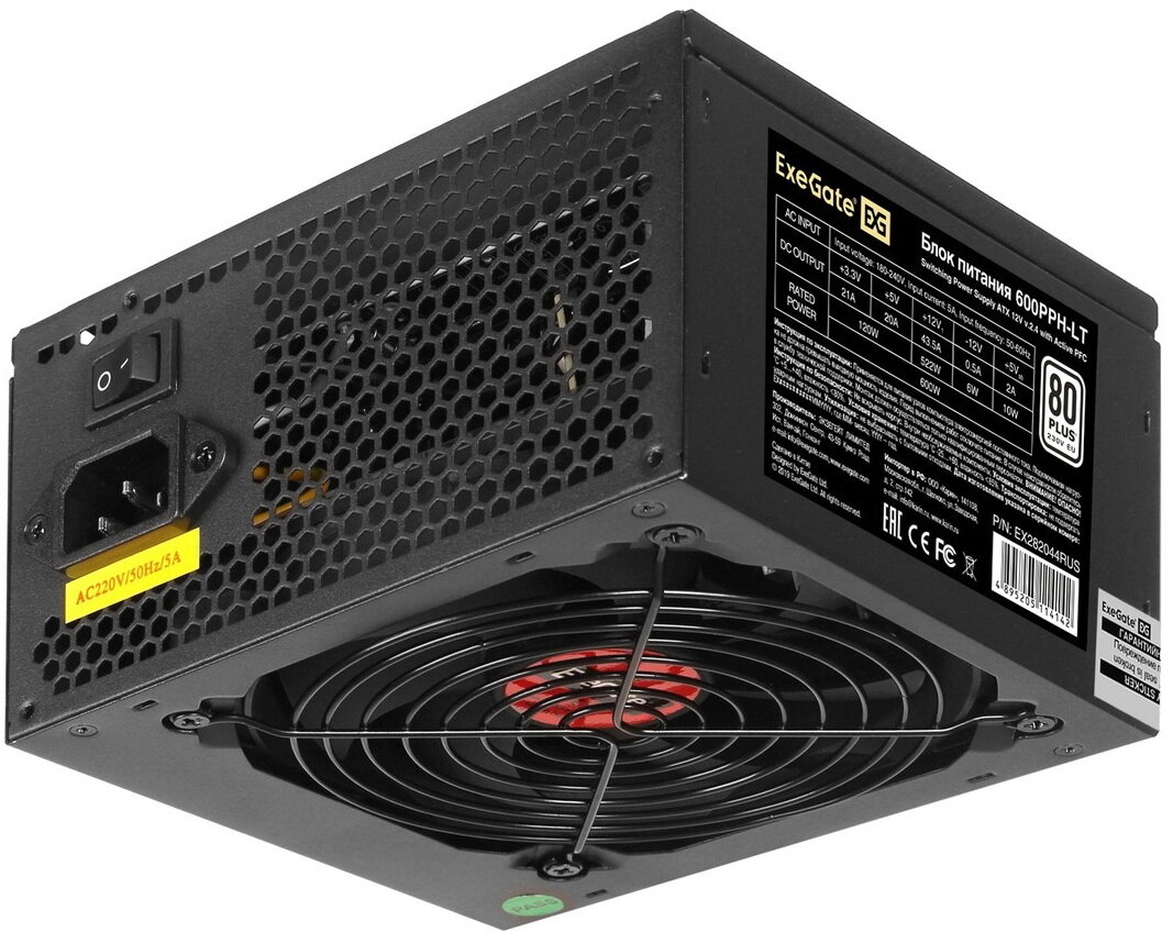 EX282044RUS-OEM-S, Блок питания 600W ExeGate 80 PLUS® 600PPH-LT-S-OEM (ATX, APFC, КПД 82% (80 PLUS)SC, 12cm fan, 24pin, 2x(4+4)pin, 2xPCI-E, интересное: