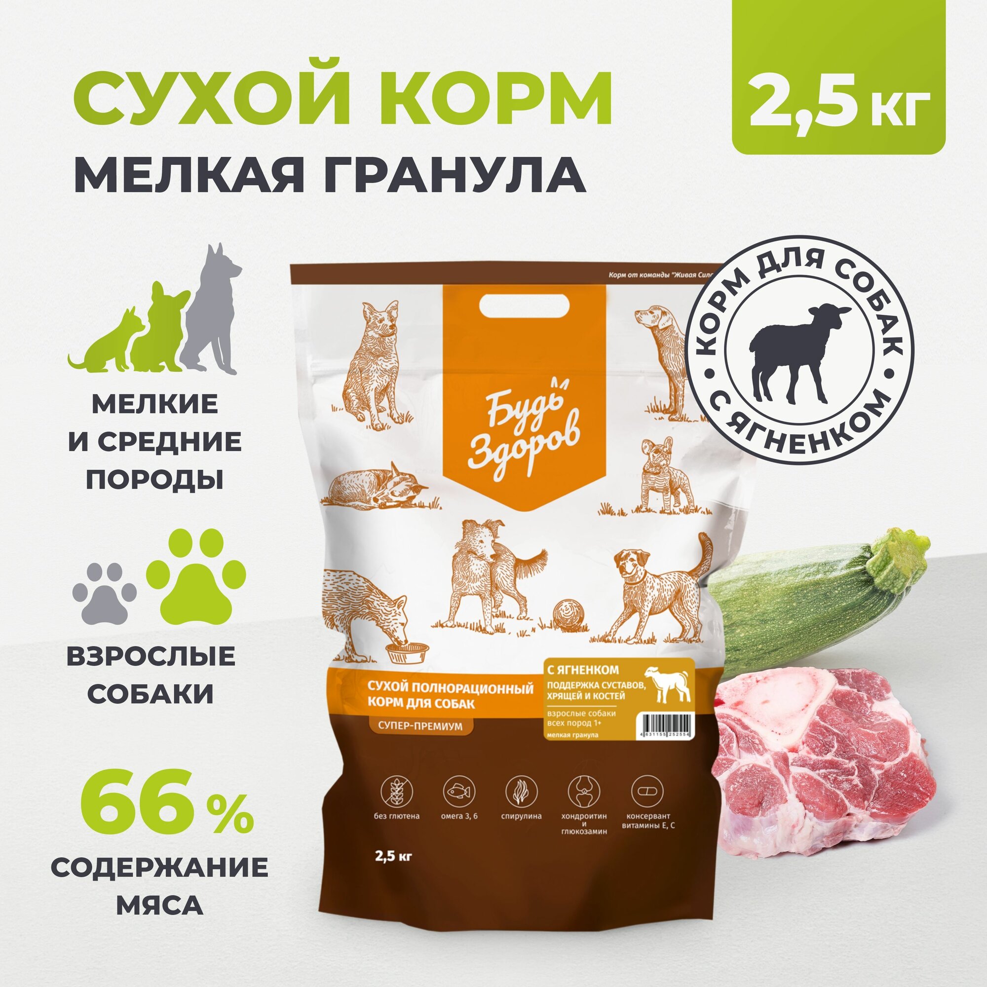 Будь ЗДОРОВ_ЖИВАЯ сила Корм для взрослых собак всех пород от 1 года с ягненком, Мелкая гранула (2,5 кг)