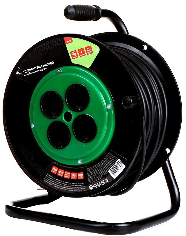 Удлинитель силовой 50 м, 10А, тип УХ10, ПВС, на кабельной катушке, 4 розетки без заземления СИБРТЕХ 95855