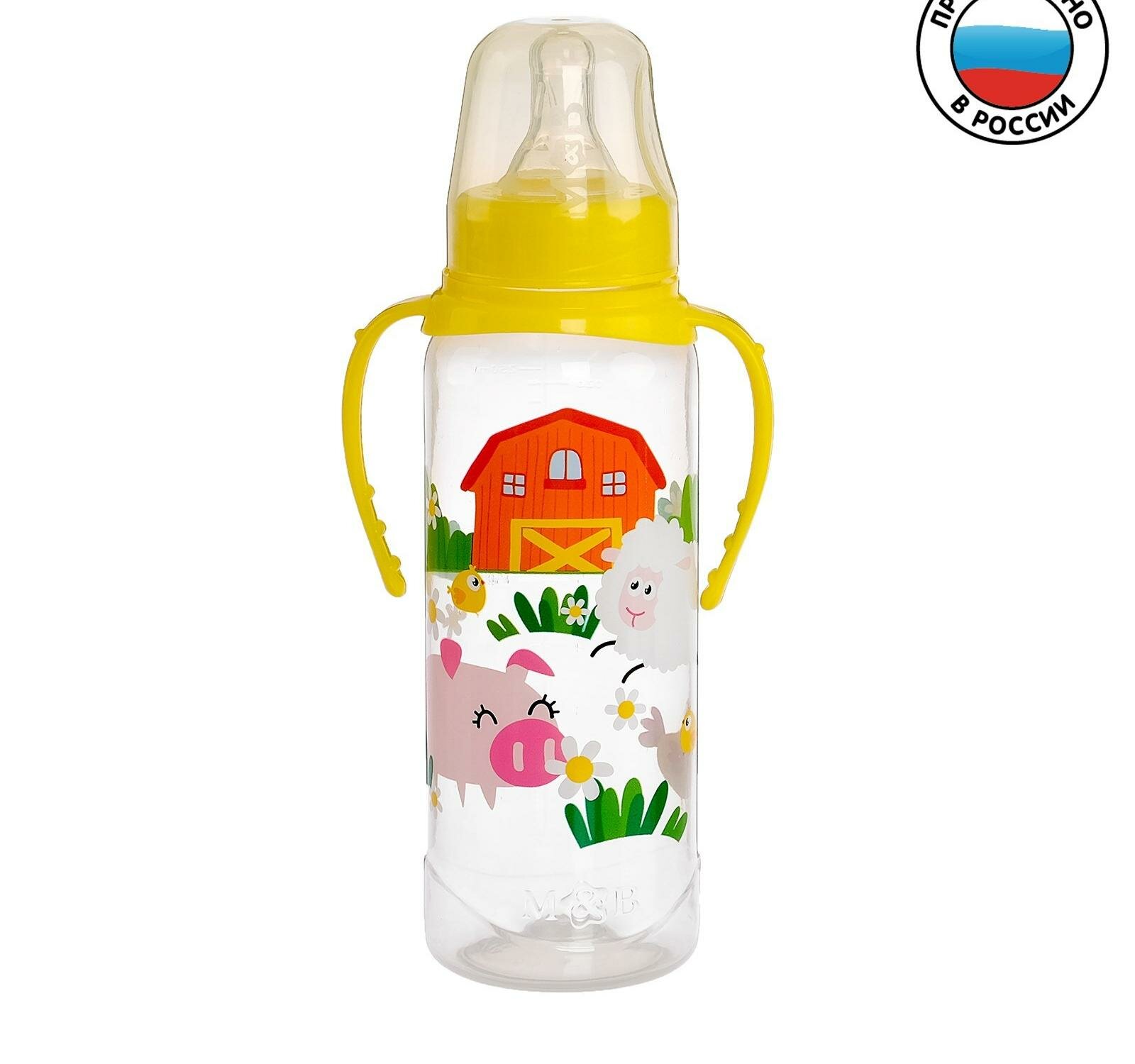 Бутылочка для кормления «Весёлая ферма» детская классическая, с ручками, 250 мл, от 0 мес., цвет жёлтый