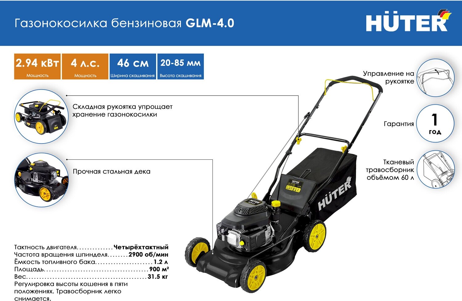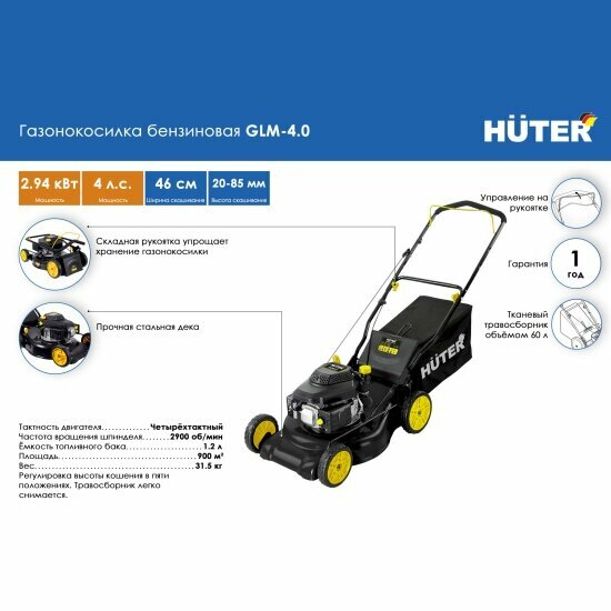 Бензиновая газонокосилка Huter GLM-4.0, 4 л.с., 46 см