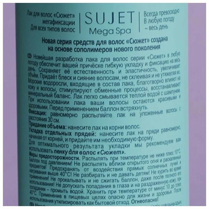 Sujet Лак для укладки волос Mega Spa, экстрасильная фиксация, 180 мл