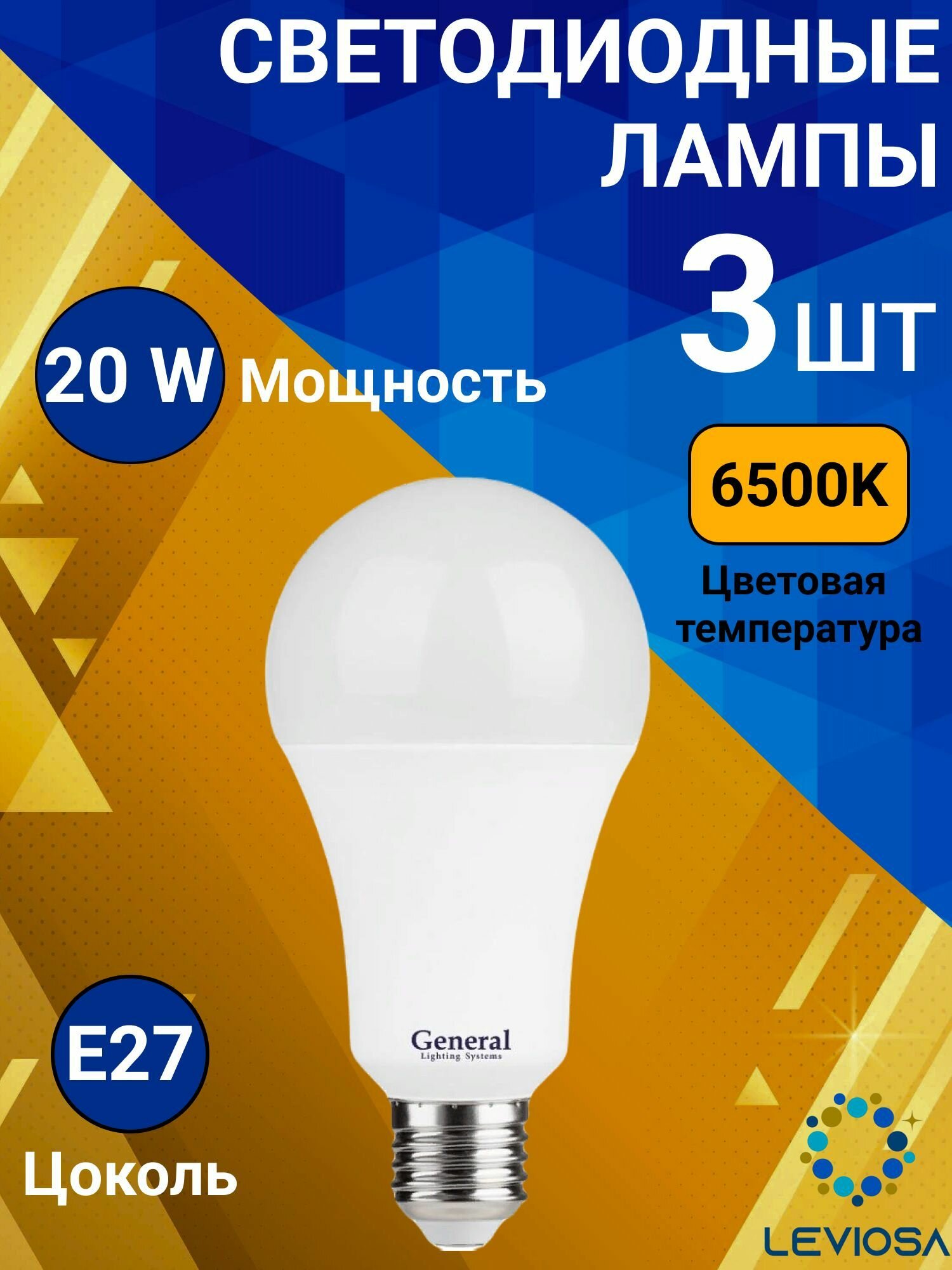 (3 шт.) Светодиодная лампочка General ЛОН A60 E27 20W 6500K 6K 60x110 пластик/алюмин. 690100 Холодный белый. Цоколь E27