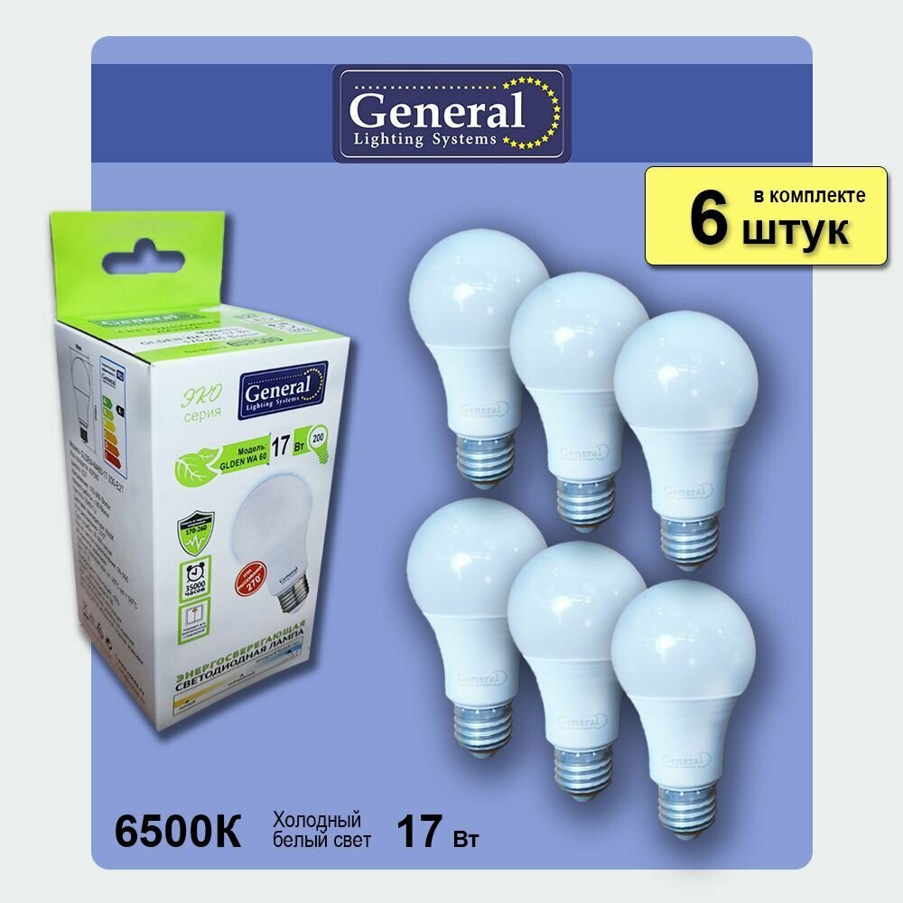 Светодиодные лампы, General, Комплект из 6 шт., Мощность 17 Вт, Цоколь E27, Холодный свет