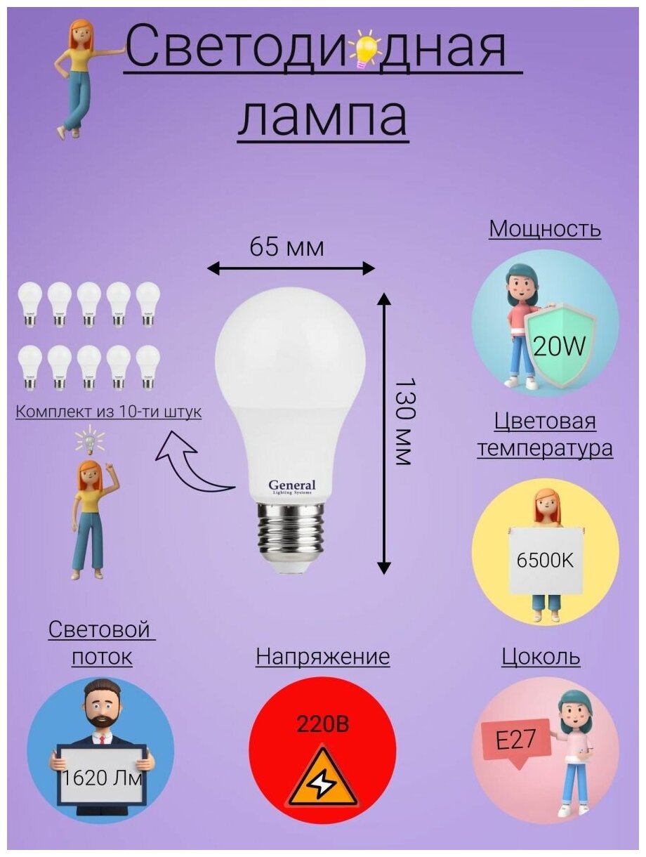 СохранитьЛампочка светодиодная, General, Комплект из 10 шт., 20 Вт, Цоколь E27, 6500К, Форма лампы Груша, WA60 интересное: