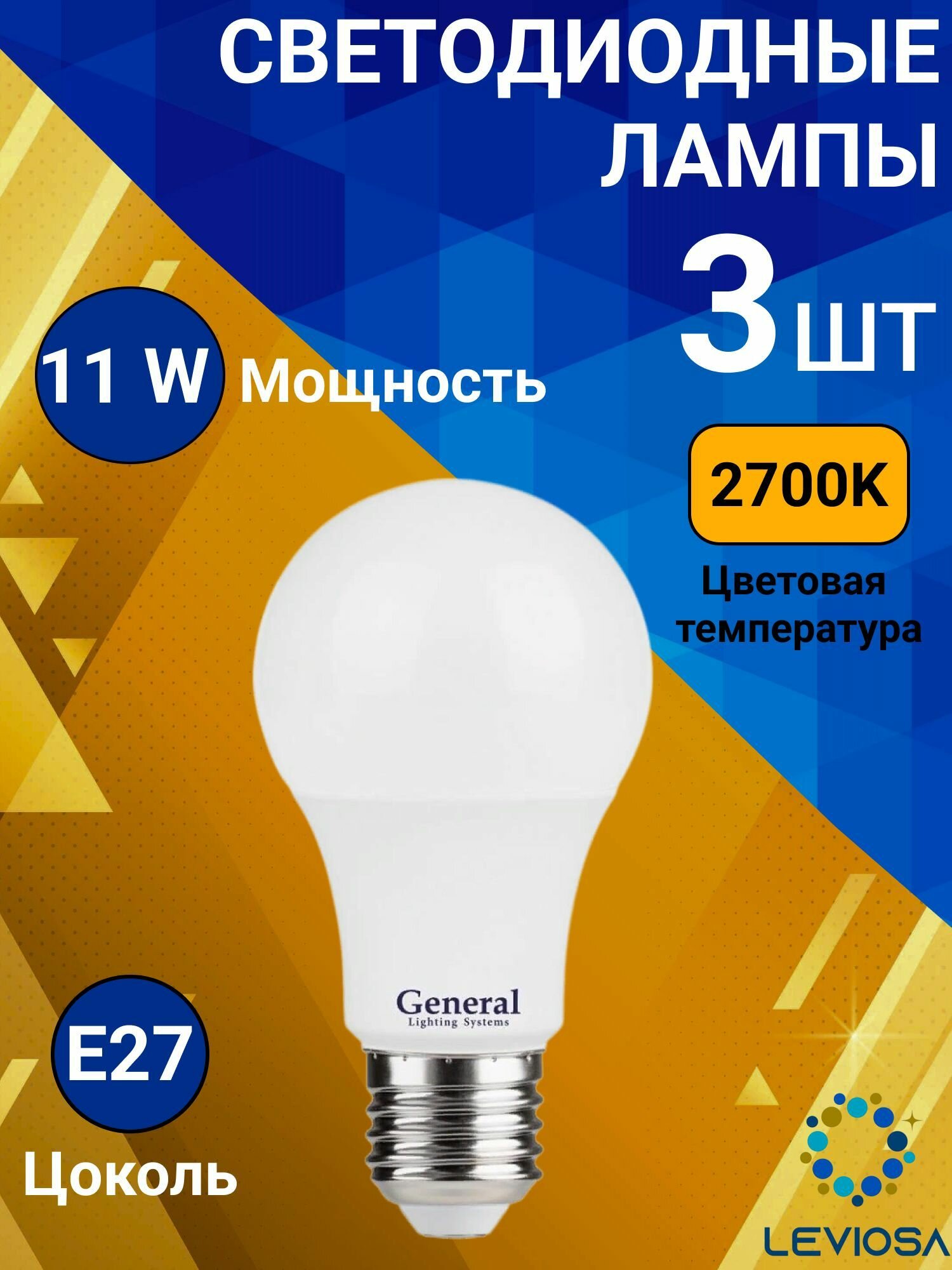 (3 шт.) Светодиодная лампочка General ЛОН A60 E27 11W 6500K 6K 60x110 пластик/алюмин. 636900 Холодный белый. Цоколь E27